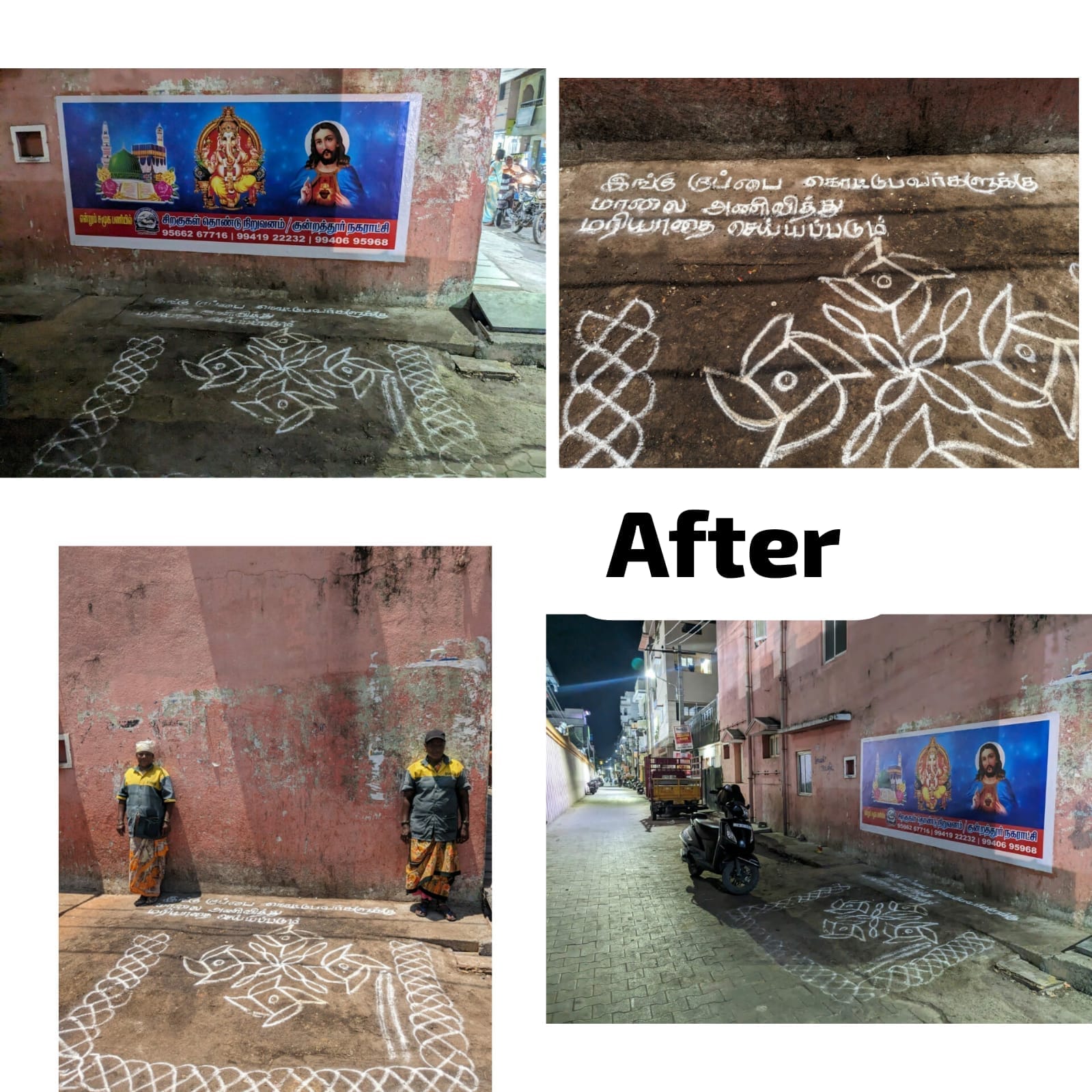 குன்றத்தூர் நாகேஸ்வரர் கோயில் அருகில் குப்பைகள் கொட்டுவதை தடுக்கும் வகையில் குன்றத்தூர் நகராட்சி நமது தொண்டு நிறுவனத்தின் கோரிக்கையை ஏற்று இன்று தூய்மை பணியாளர்களின் மூலம் அந்த இடத்தை சுத்தப்படுத்தி கோலம் போடப்பட்டது மற்றும் வரும் காலங்களில் அங்கு குப்பை கொட்டாதவாறு நமது தொண்டு நிறுவனம் மூலம் எம்மதமும் சம்மதம் என்ற மூன்று மத கடவுள்களின் புகைப்படம் பொருந்திய போஸ்டர் அந்த சுவற்றில் பொருத்தப்பட்டது.