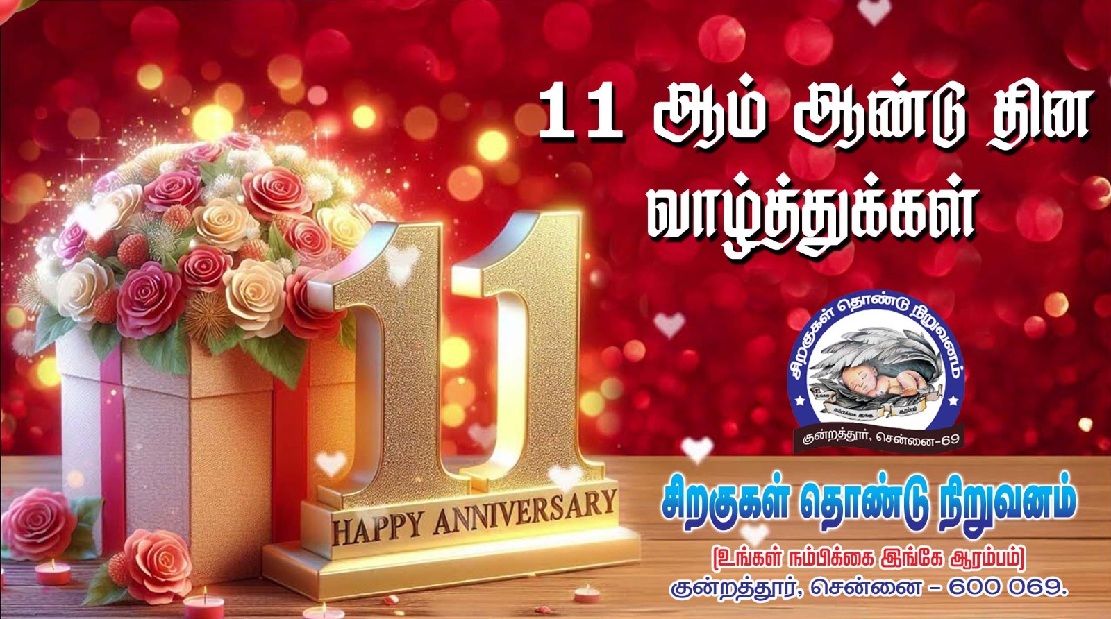 நமது சிறகுகள் தொண்டு நிறுவனம் 11-வது ஆண்டு நிறைவுபெற்று 12-ஆம் (06/12/2024) ஆண்டு அடி எடுத்து வைக்கிறது என்பதை உங்கள் அனைவருக்கும் தெரிவிப்பதில் பெருமகிழ்ச்சி அடைகிறோம். இந்த 11 ஆண்டுகளில் கல்வி, மருத்துவ உதவி, மருத்துவ முகாம்கள், இரத்த தான முகாம்கள், புற்றுநோய் விழிப்புணர்வு, வெள்ள நிவாரணம், டெல்டா பேரிடர் நிவாரணம், கோவிட்-19 நிவாரணப் பணிகள், குழந்தைகள் புற்றுநோய் விழிப்புணர்வு மிதிவண்டி பேரணி போன்ற பல சமூகப் பணிகளில் ஈடுபட்டுள்ளோம் என்பதை நம் சிறகுகள் தொண்டு நிறுவனத்தின் சார்பாக நாம் அனைவரும் இதற்காக நன்றியுடனும் பெருமையுடனும் உணர்வோம், உங்கள் அன்பான மற்றும் சரியான நேரத்தில் ஆதரவளித்த உங்கள் அனைவருக்கும் நம் சிறகுகள் தொண்டு நிறுவனத்தின் சார்பாக நன்றிகளை தெரிவித்துக் கொள்கிறோம். மேலும், எதிர்காலத்திலும் உங்கள் ஒத்துழைப்பை எதிர்பார்க்கிறேன். நாம் இன்னும் பல படி சென்று இன்னும் பெரிய சமூக நடவடிக்கைகளில் ஈடுபட வேண்டும். இதுவே நமது இலக்காகவும் உறுதிமொழியாகவும் இருக்க வேண்டும் என்று இந்நாளில் உங்களை அன்போடு கேட்டுக்கொள்கிறோம்.