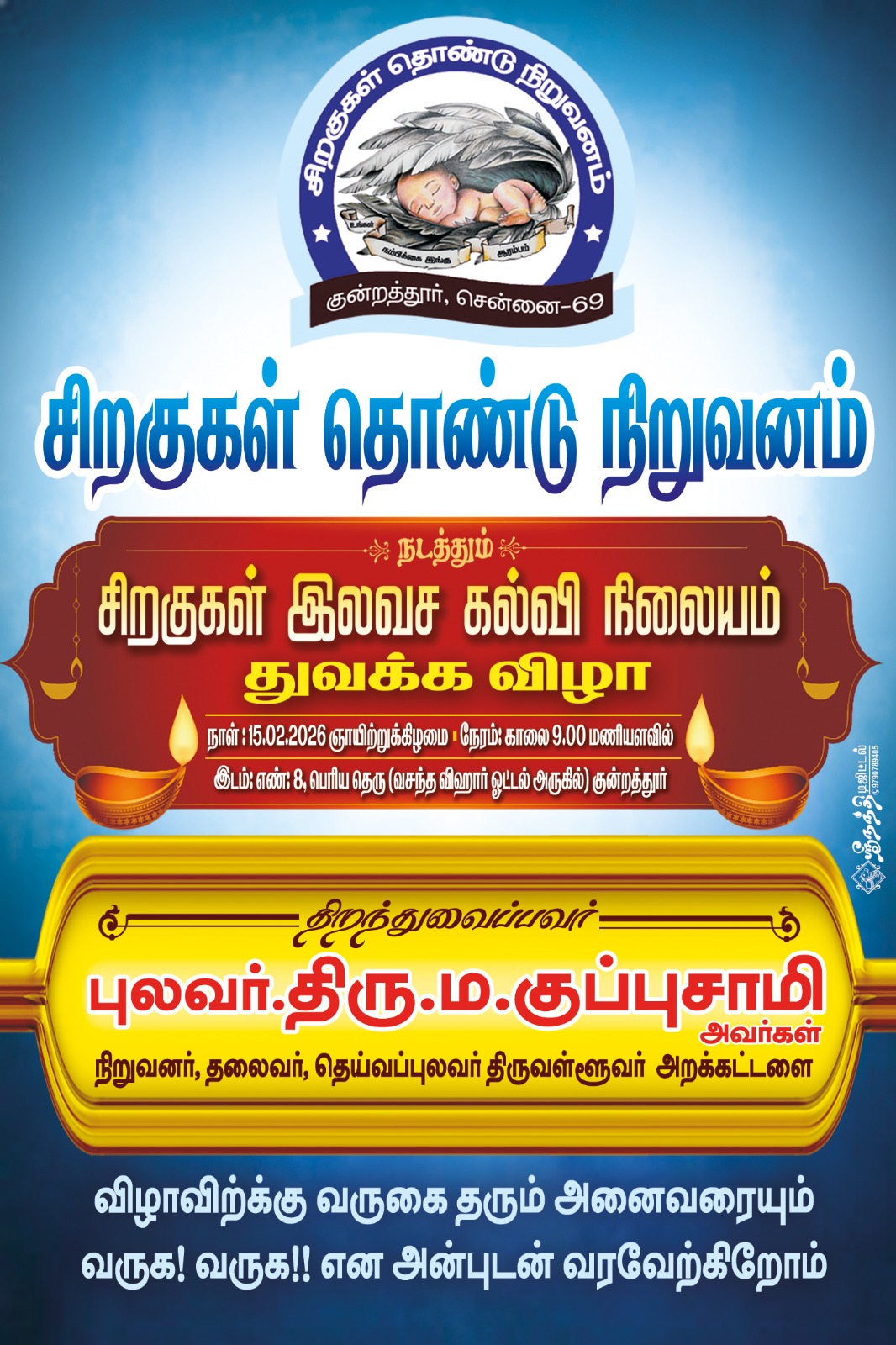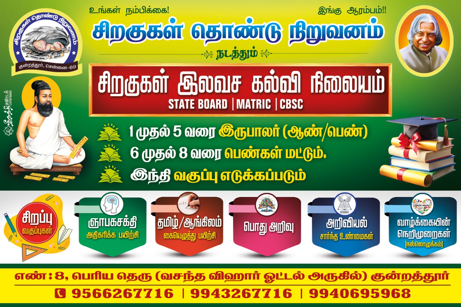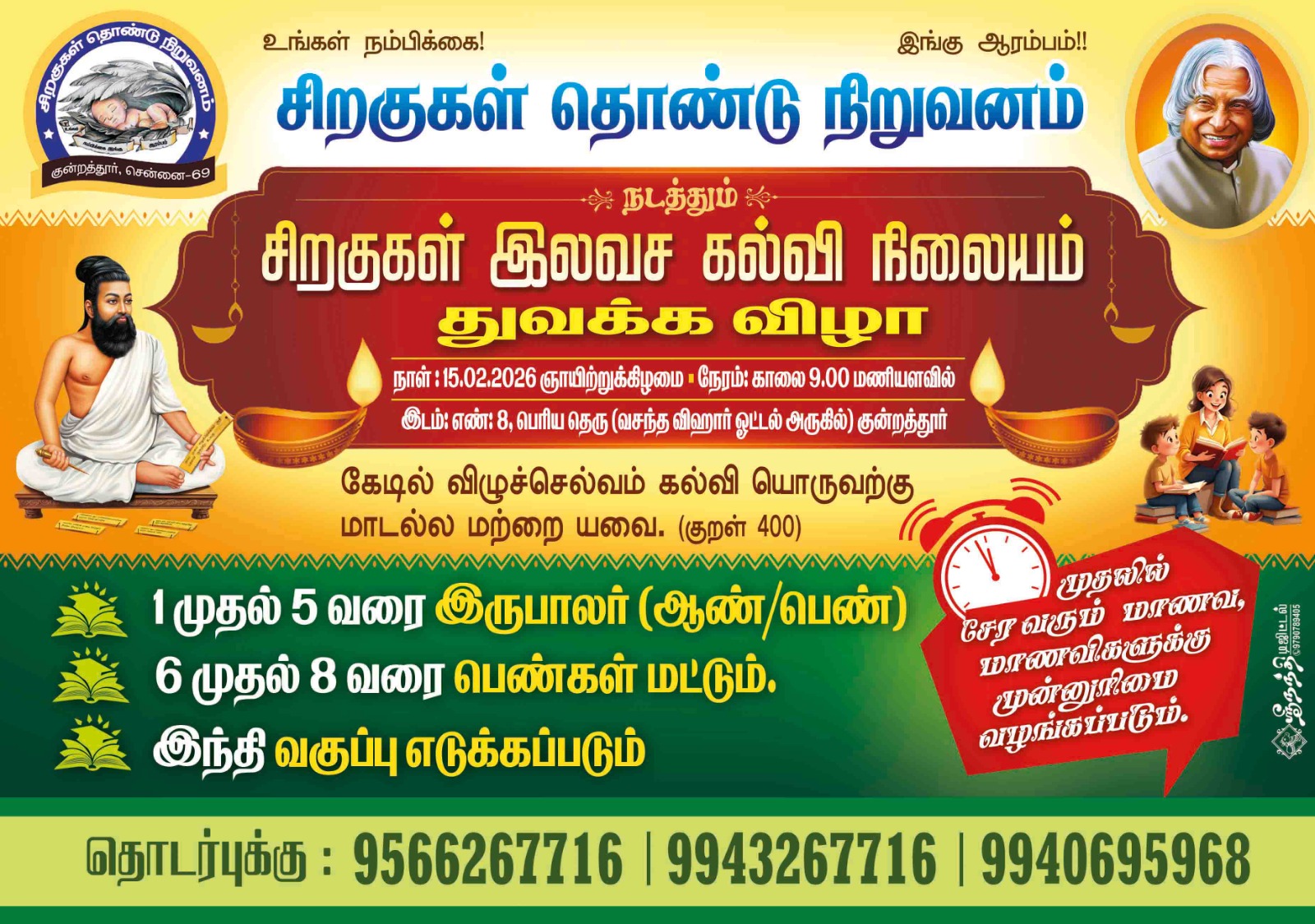 சிறகுகள் இலவச கல்வி நிலையம் வரும் ஞாயிற்றுக்கிழமை (15.02.2026) காலை 9.00 மணி அளவில் தொடங்கப்படுகிறது